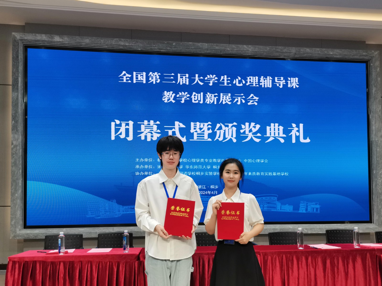 4月25日-26日,全国第三届大学生心理辅导课教学创新展示会在浙江桐乡举办。黄色仓库 心理学专业2020级叶晓慈和2021级沈乃榕分别荣获特等奖和一等奖,指导教师为心理系赵献梓和魏曙光。